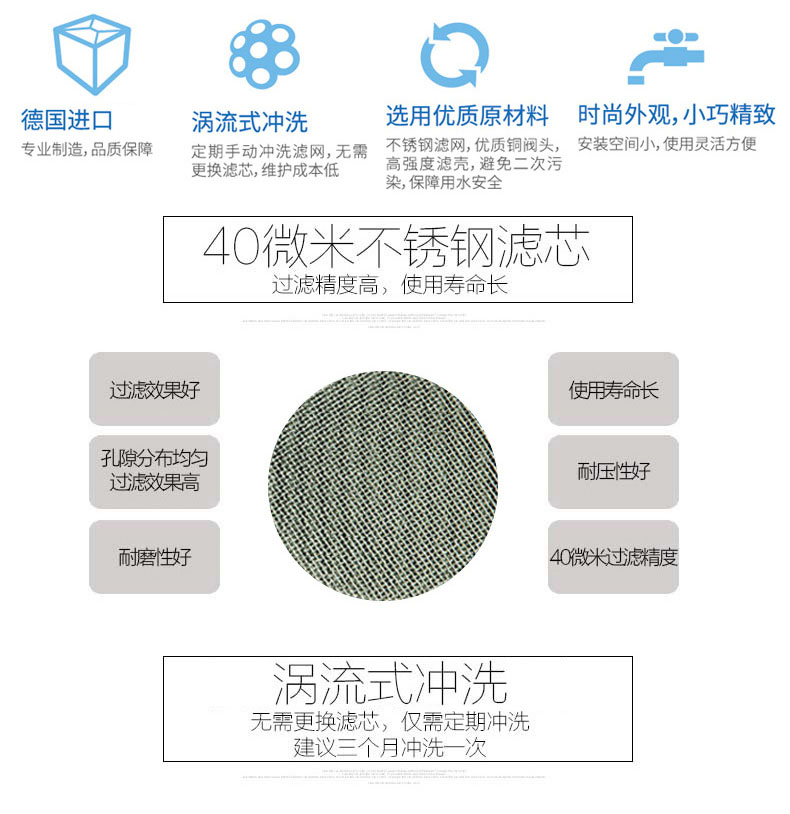 ● 40微米過濾,能有效過濾雜質(zhì)、泥沙、鐵銹、蟲卵