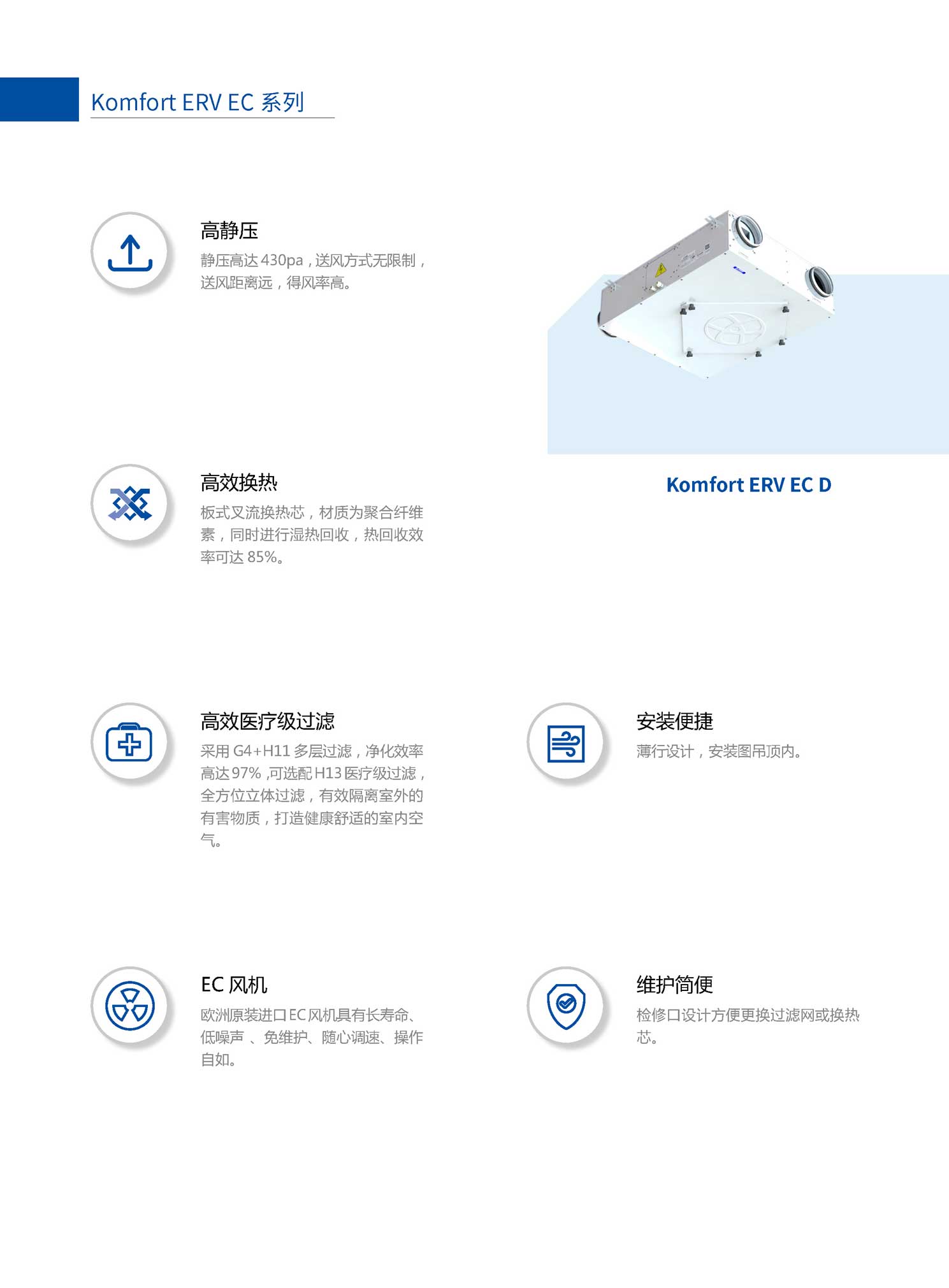 ● 高靜壓,靜壓高達430pa,保證末端新風量