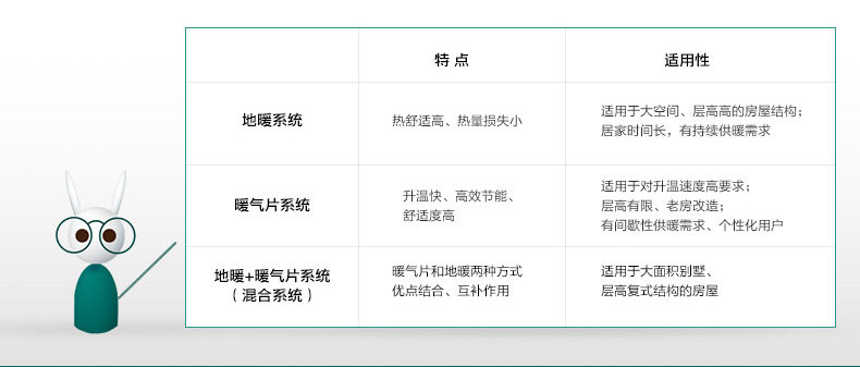 目前市場上供暖有散熱片系統和地暖系統,散熱片系統使用方便,每組散熱片均設有控制閥門,控制方便,升溫快,并可以使用實木地板。